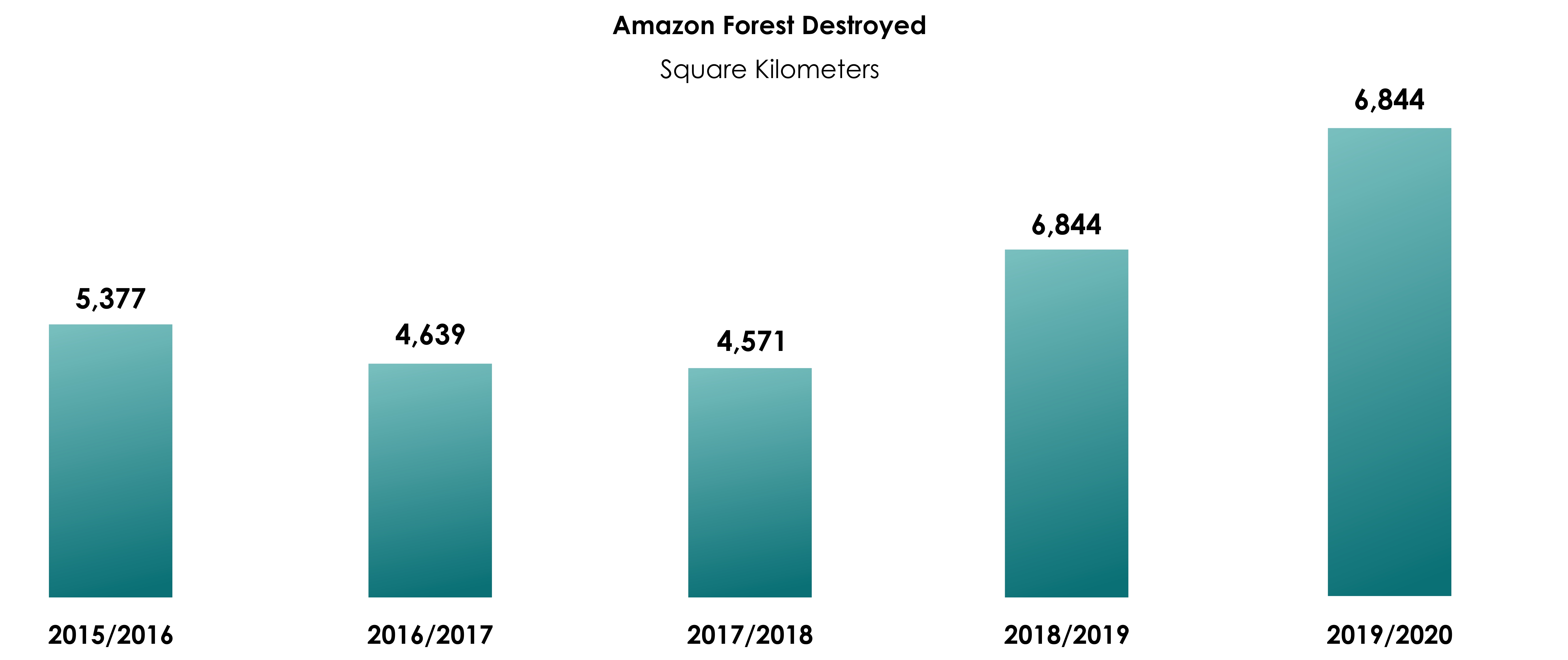 Scientific evidence cannot be disputed. More than 9,200 square miles [9,200 square kilometers] of Amazon rain forest were lost between August 2019 and July 2020, according to Brazil's National Institute for Space Research (INPE), a 34% increase from the 12-month period ending in July 2019 (Exhibit 1). From January to August 2020, INPE reported that there were three times as many fires in Brazil's Pantanal wetlands, a UNESCO World Heritage site that is home to some of the world's largest floods and biodiversity. Two provinces in the Pantanal, where about 25% of Brazil's cattle reside, are currently experiencing a cattle shortage that accounts for 80% of the price of packing meat.
